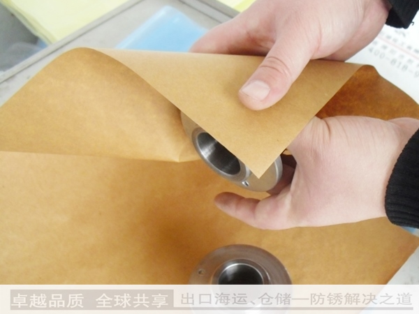 4、包裝過程---將含有緩蝕劑的面朝向金屬包裝,不覆膜防銹紙可作為金屬產品間墊層隔材使用,以免其他材質阻隔材料含S、CL化學成分,影響防銹效果